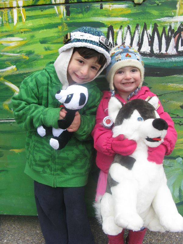 And here are the kiddos together. Sadie is showing off her big doggie. It only took Daddy $5 at skee-ball this year! Hey, Panda, what are you lookin' at? |