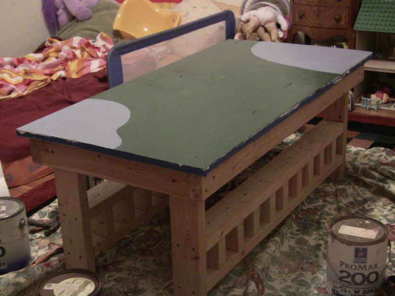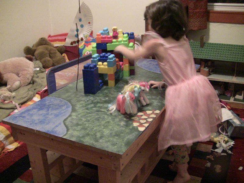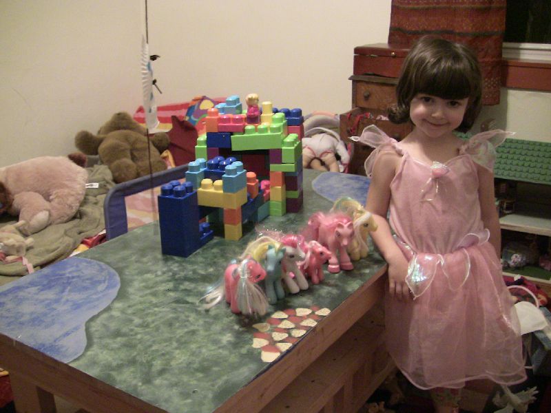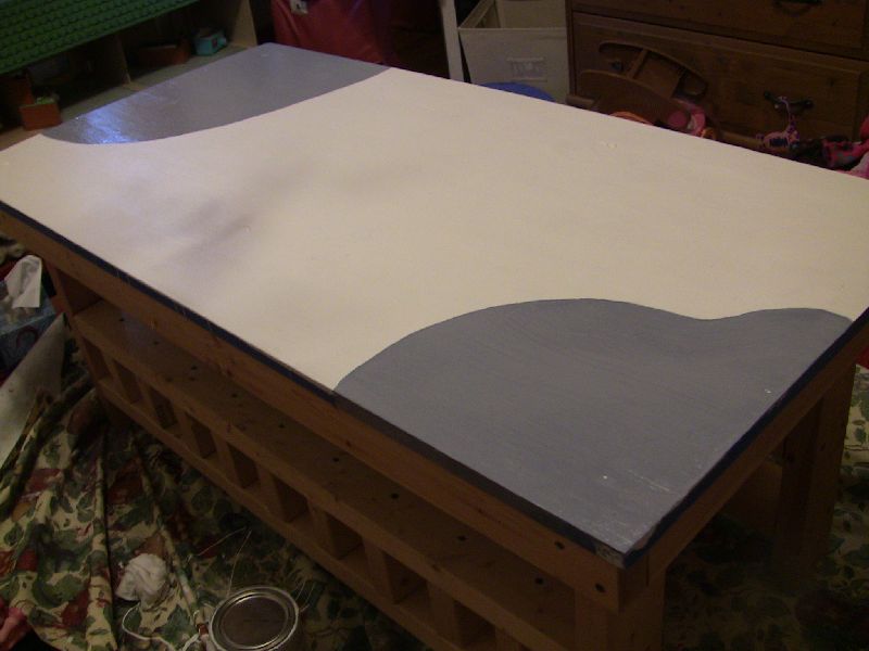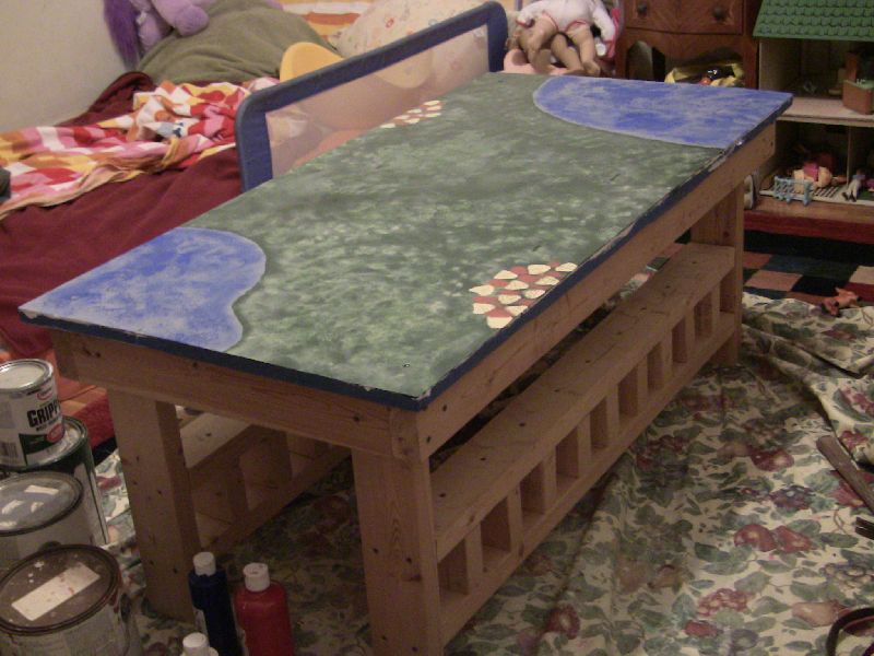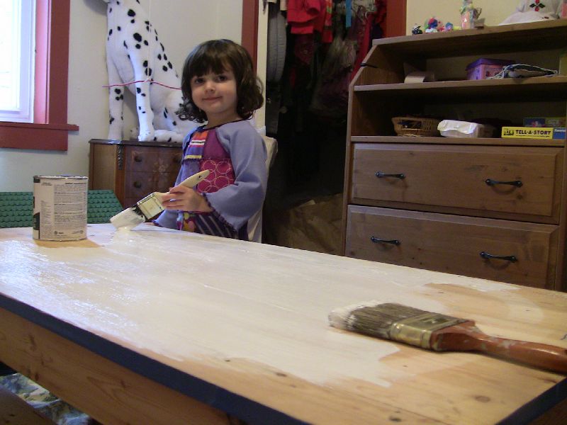 Sadie, Micah and I had a good time converting what was originally Micah's train table into a table for Sadie's animals to live on. Here Sadie is helping with the first coat of primer. The train table was rough and rustic, but we wanted the animals to have a nice lush place to live.