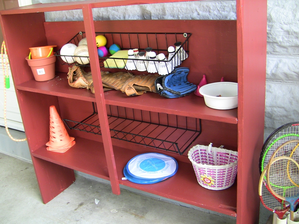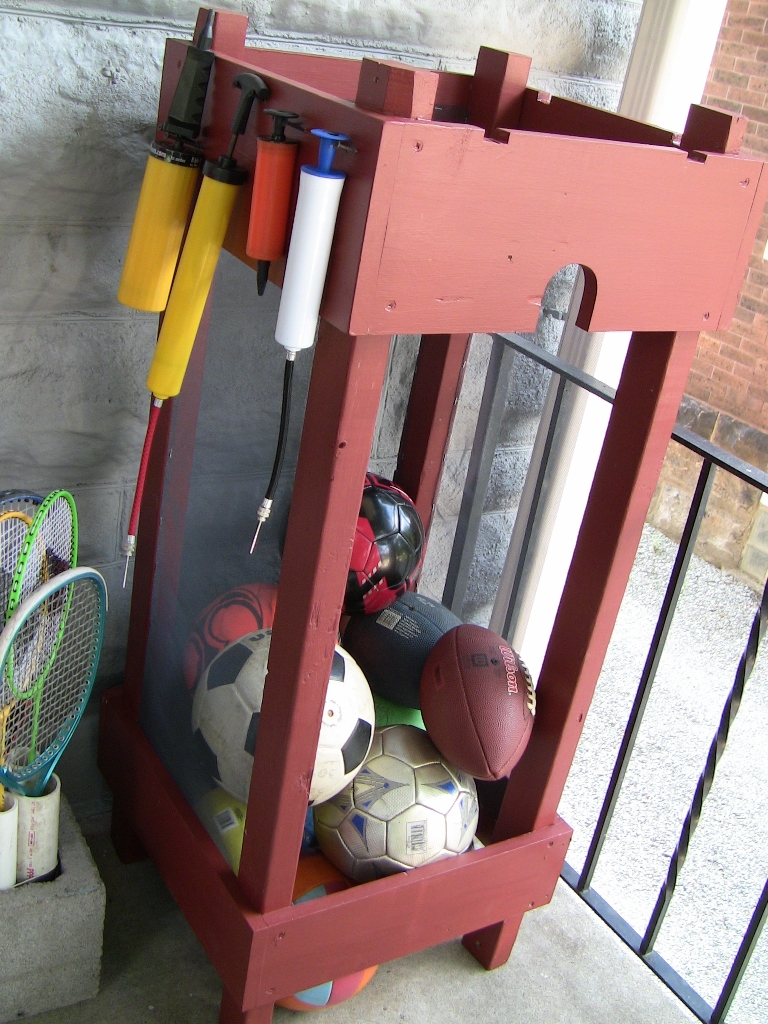 SportganizationStuff collects. All the summer sports are great, but the resulting clutter is a challenge. So, we built this sportganization center on the back porch! |