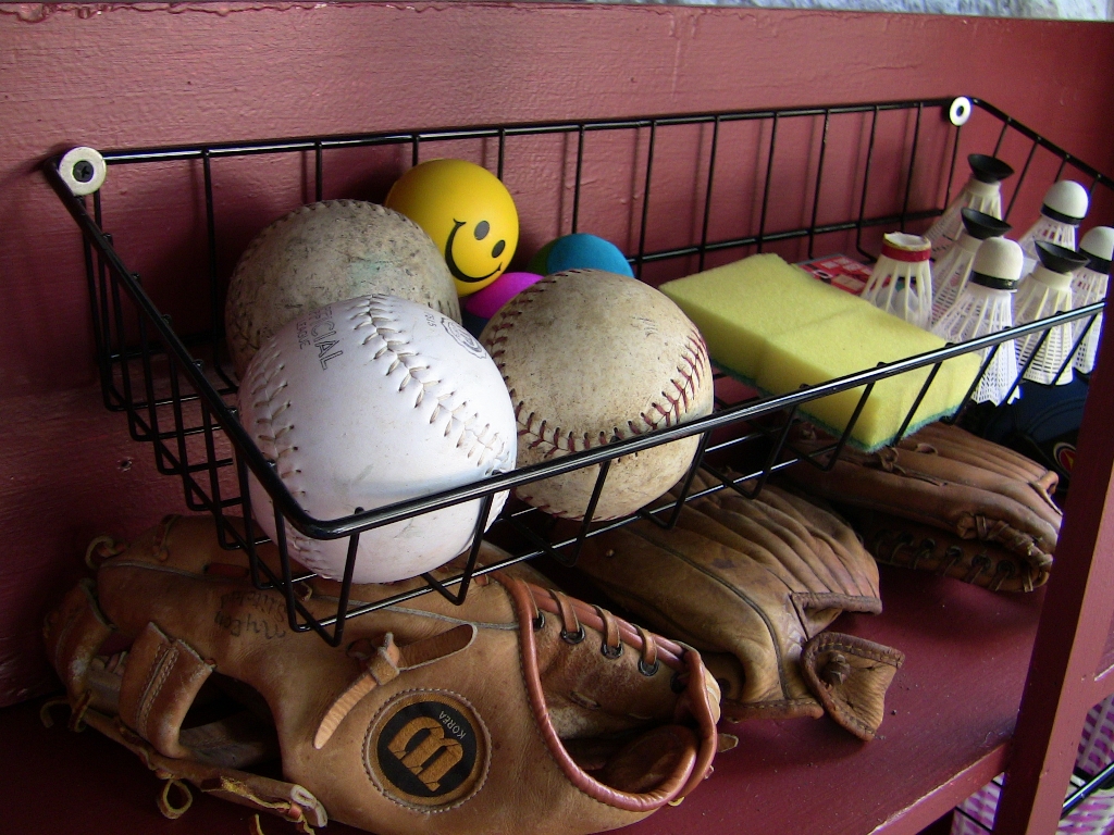 Some leftover baskets added the perfect organizational touch -- they were easy to mount with drywall screws and large washers. The perfect place for smaller balls, shuttlecocks, and the like. Jen has been teaching me a lot about upcycling! |