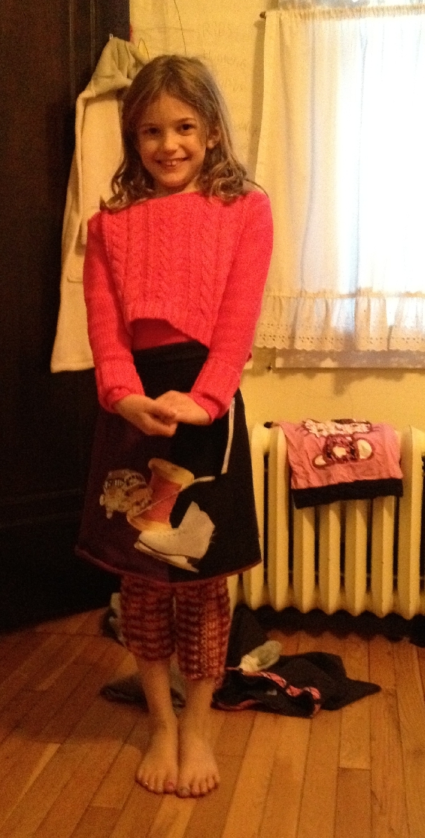 Zora wearing a custom-made skirt emblazoned with her favorite things