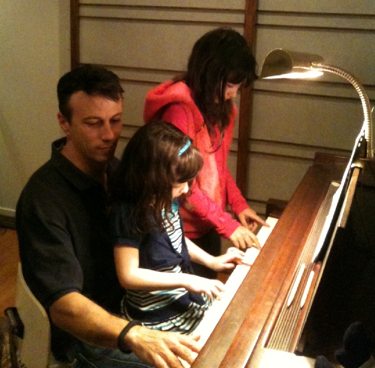 Sadie playing piano with Daniel and Alex Kraft